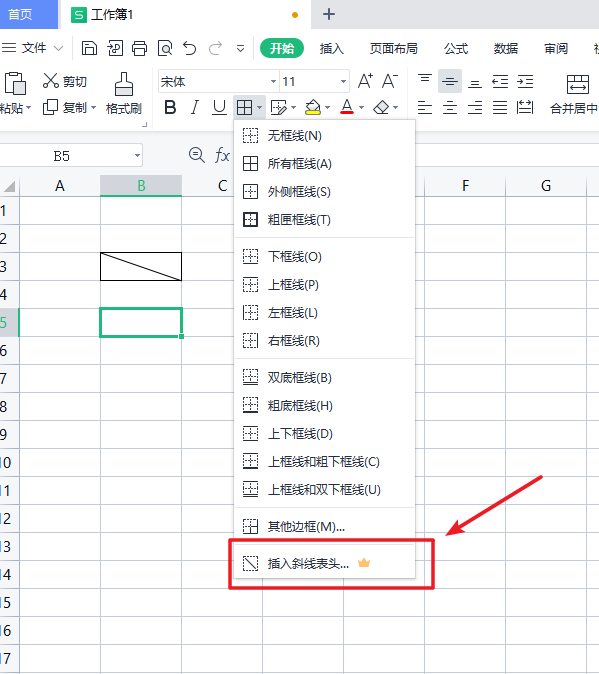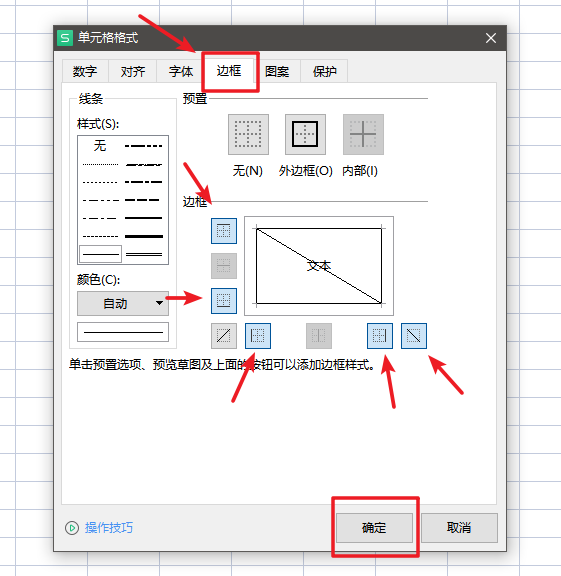 2、在弹出窗口点击【边框】,依次点击【外边框】及【斜线】;