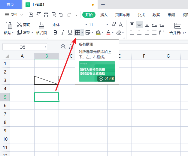 1、选中需要设置斜线的单元格,找到【所有框线】按钮;