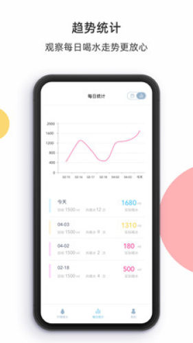 1、提供多种趋势统计图表,为用户提供更详细的饮水数据分析,让用户更全面地了解自己的身体状况。