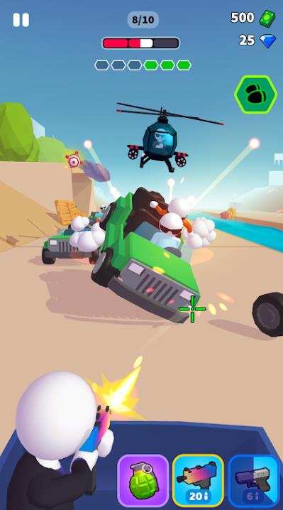 街口枪战手机版是一款街头射击游戏。游戏中,玩家将驾驶自己的车辆对敌人进行连续射击。每个敌人都非常强大,所以玩家需要使用载具来不断阻挡敌人的攻击。为自己赢得更多的机会。另外,玩家还可以利用汽车的高防御来打击敌人,使敌人的汽车无法启动。