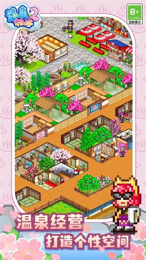 温泉物语2是一款像素风格的店铺经营游戏。玩家在游戏中拥有自己的温泉。你需要不断的改造和打造你的温泉环境,才能吸引更多的客人。有不同的效果,你可以在游戏中感受到最真实的温暖文化,并赚取收入来不断扩大自己的商店。